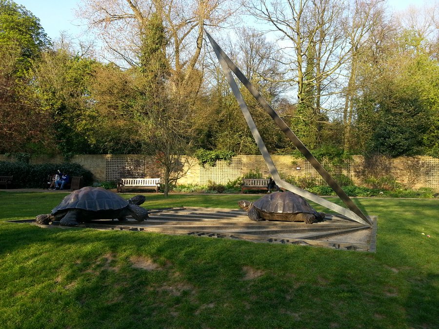 Londonas Holland parkā ir divi saules pulksteņi. Viens no tiem ir ar ārkārtīgi interesantu vizuālo un sižeta risinājumu – uz liela izmēra ciparnīcas ir uzkāpuši divi ievērojama izmēra bruņurupuči. Kompozīcija “Tortoises with Triangle and Time” (Bruņurupuči ar trijstūri un laiku) ir veidota par godu tūkstošgades mijai. Bērniem bruņurupuči ir simpātiski un lēnīgi tēli, bet pieaugušajiem te ir viela pārdomām par laika gaitu – vai laiks rit lēni, vai gausi. Iespējams, kāds atcerēsies rakstnieka Luisa Kerola stāstu “What the Tortoise Said to Achilles”, kurā ir bruņurupuča un Ahileja dialogs ar loģikas apgalvojumiem un secinājumiem. Tajā ir apspēlēts trijstūra malu vienādības jautājums. Interesants paraugs interpretācijai par klasiskā horizontālā saules pulksteņa tēmu.